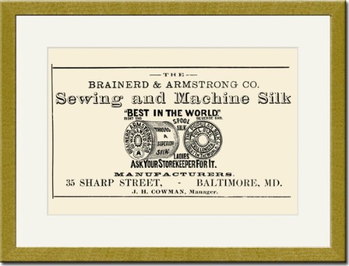 FREE SHIPPING on this item when you purchase 2 or more Framed Art Posters from ClassicPix.com. This high quality art poster is matted and framed by our professional framers, and arrives fully assembled and ready to hang. The durable gold wood frame measures 17x23 inches - poster size is 12x18 inches. A clear plexiglass facing protects your poster and adds a lusterous shine. Posters are printed on heavy-stock, semi-matte paper producing the best possible combination of color vibrancy and durability. All posters from ClassicPix.com are produced and framed on demand one-at-a-time, just for you - not mass-produced. Our personal hands-on processing assures the highest quality. What do our customers say? "The product I received was absolutely stunning. I can not speak highly enough about the quality of this piece of art. I would not hesitate to order from them again!" --- "Item arrived very quickly. Was even better than I'd hoped! Many, many thanks! Beautiful!" Each of our images is available in a variety of sizes and formats, including matted/framed posters and mounted canvas prints. To see all formats available for this image, use the search box above and enter "classicpix: Brainerd & Armstrong Co. Sewing and Machine Silk" (do not include quotation marks). Questions? Feel free to contact us with any question about any of our 100,000+ products. We're here to serve you, and we love hearing from our customers!