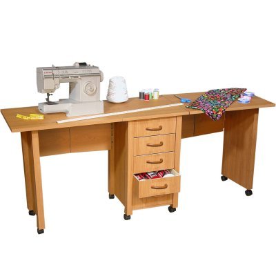 Shop for Desks from SewingTableShop.com! The Venture Horizon Lamont Double Mobile Desk provides an extra-long workspace. Opens to create a workspace 72 inches wide. Folds down to 19 inches wide 18 inches deep and 29 inches high to help you save space when you aren't using it. Six dual-track carpet casters let you roll the desk wherever you need it. Five central drawers make it easy to reach stored accessories from either side. The white-finished desk features beadboard details on the side with nickel-finish handles and the light wood-finished desk features bronzed handles. The black desk has nickel-finished handles. Use this large double desk for working on your sewing crafts and for general work.Drawer Interior Dimensions: 10.5W x 13.5D x 3H inchesAbout Venture HorizonVenture Horizon Corporation established in 1985 is a full-service product development organization specializing in ready-to-assemble (RTA) furniture. They offer a variety of merchandise in several product categories at competitive prices. Their creative designs have been heralded by every major catalog and numerous retailers for nearly three decades. Because they are active in every phase of the manufacturing and distribution process they are able to guarantee the highest quality materials products and packaging.In order to ensure a competitive place among leading RTA furniture manufacturers they work in a variety of mediums including solid hardwoods MDF particle board steel plastic and glass. Since variety is crucial to consumer acceptance they produce their furniture in several finishes such as melamine paper and vinyl. In addition they offer a variety of popular finish options that change with the seasons as well as with the times.